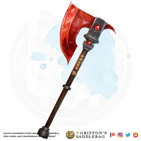 ◆ Cuando una criatura te ataca la hoja del hacha se vuelve rojo sangre. Recibes+2 en tus tiros de ataque contra esa criatura hasta que le aciertes un ataque y agregas1d6 de daño del mismo tipo del arma. Después de causar daño el arma vuelve a la normalidad.